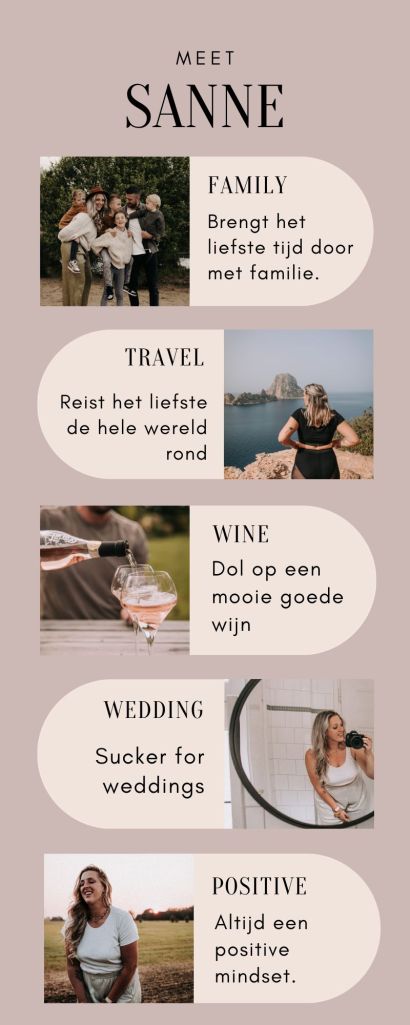 Hi! Super leuk dat je mijn pagina bekijkt en wat meer over mij wilt weten. Ik ben Sanne. Getrouwd met mijn grote liefde en samen hebben we vier prachtige kinderen. We wonen in het mooie Brabant. Ik heb altijd al een grote voorliefde gehad voor fotografie maar sinds ik mama ben, ben ik er echt iets mee gaan doen. Na verschillende workshops en mijn eerste bruiloft te hebben mogen fotograferen wist ik het zeker! Dit is écht iets voor mij!