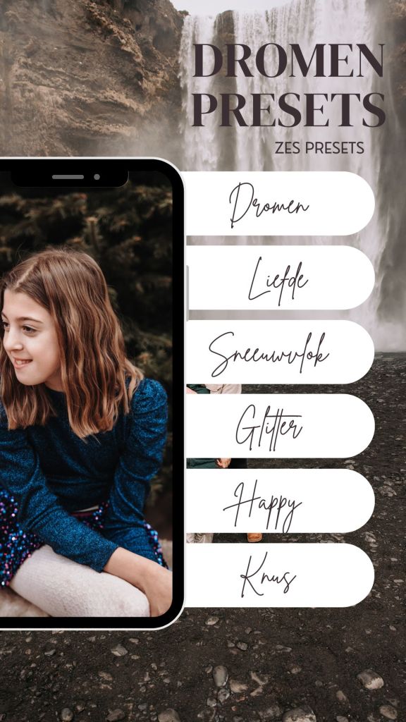 Bestaat uit zowel de Mobile presets als de Desktop presets. Een compleet pakket dus! Ook ontvang je een PDF waarin duidelijk uitgelegd staat hoe jij de presets op je telefoon zet. En ontvang je de extra module: ‘Handig om te weten.’ Met daarin extra tips en uitleg over de presets. Alles dus om aan de slag te gaan met het omtoveren van jouw foto’s!